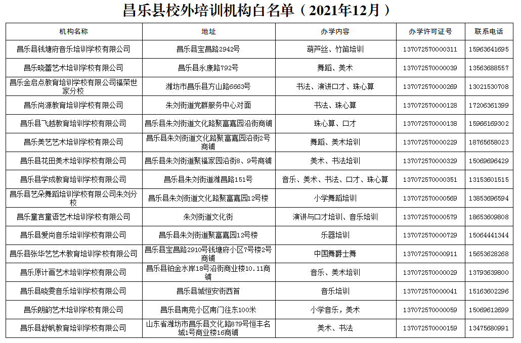 根据中央办公厅、国务院办公厅《关于进一步减轻义务教育阶段学生作业负担和校外培训负担的意见》和省市相关工作要求,对校外培训机构的资质进行了重新审核认定,现将2021年12月校外培训机构白名单公示如下:
