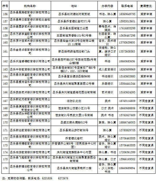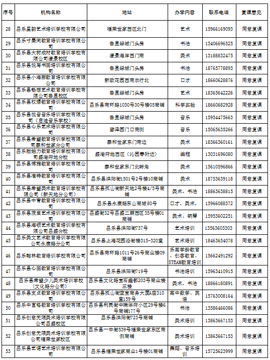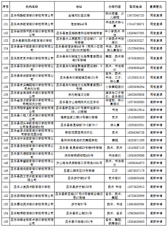 昌乐县校外培训机构第一批复学核验意见汇总表(5月份)
