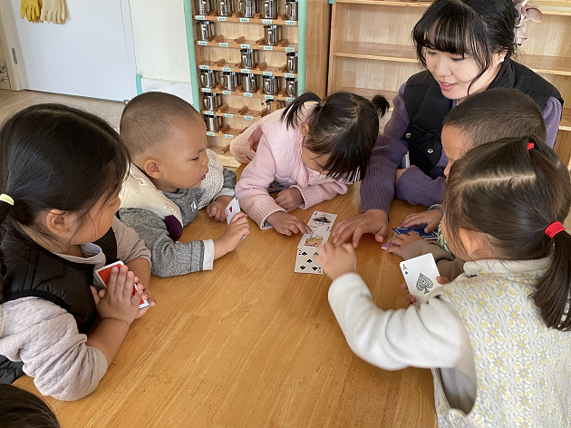 中班的孩子们则开启了纸牌排序与比大小的挑战。他们手握纸牌,认真比对数字的大小,按照从1到10的顺序进行排列,或是在“比大小”的对战游戏中,大声喊出“我的5比你的3大”,在充满趣味的角逐中,轻松掌握了数的顺序与大小比较的数学知识。