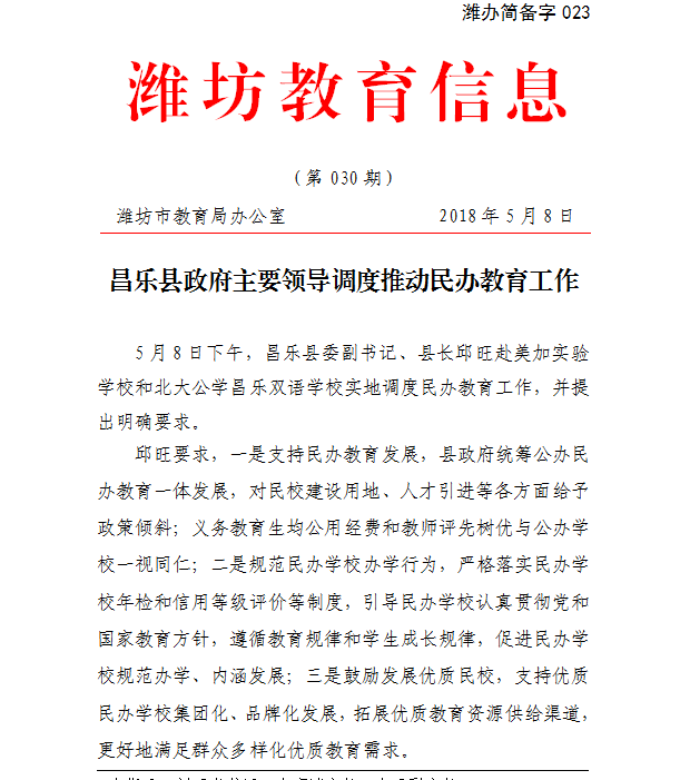 潍坊教育信息第030期:昌乐县政府主要领导调度推动民办教育工作