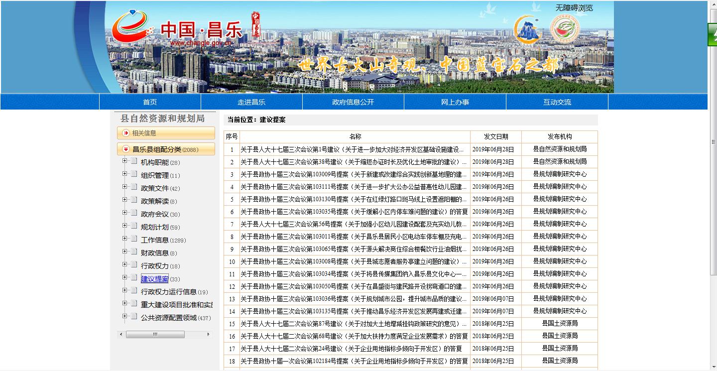 2019年,昌乐县自然资源和规划局共承办人大代表建议2件,办理人员对人大建议进行全面调研,运用掌握的第一手资料,根据上级政策情况、全县自然资源实际,提出切实可行的措施和方案,使答复满意率为100%,均已在政府网站(或通过其他形式)进行了公开。