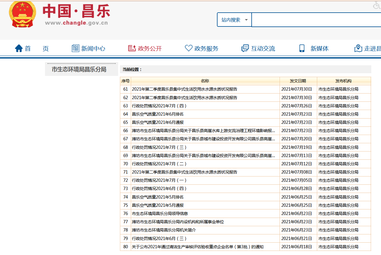 潍坊市生态环境局昌乐分局政府信息主要通过潍坊市生态环境局昌乐分局信息公开专栏和“昌乐环境”微博主动公开政府信息。