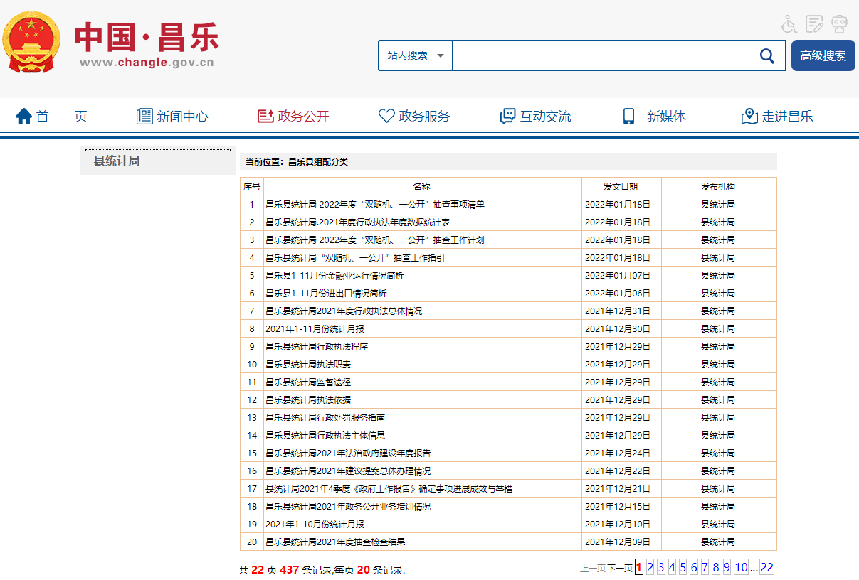 (四)公开平台建设情况。县统计局政府信息主要通过中国·昌乐网、潍坊统计信息网、《昌乐日报》、昌乐传媒网主动公开信息,2021年主动公开信息100余条,方便了人民群众了解我县各类经济指标和统计工作动态。同时,充分利用保密自查软件,使单位的电脑安全运行,信息公开更加准确。