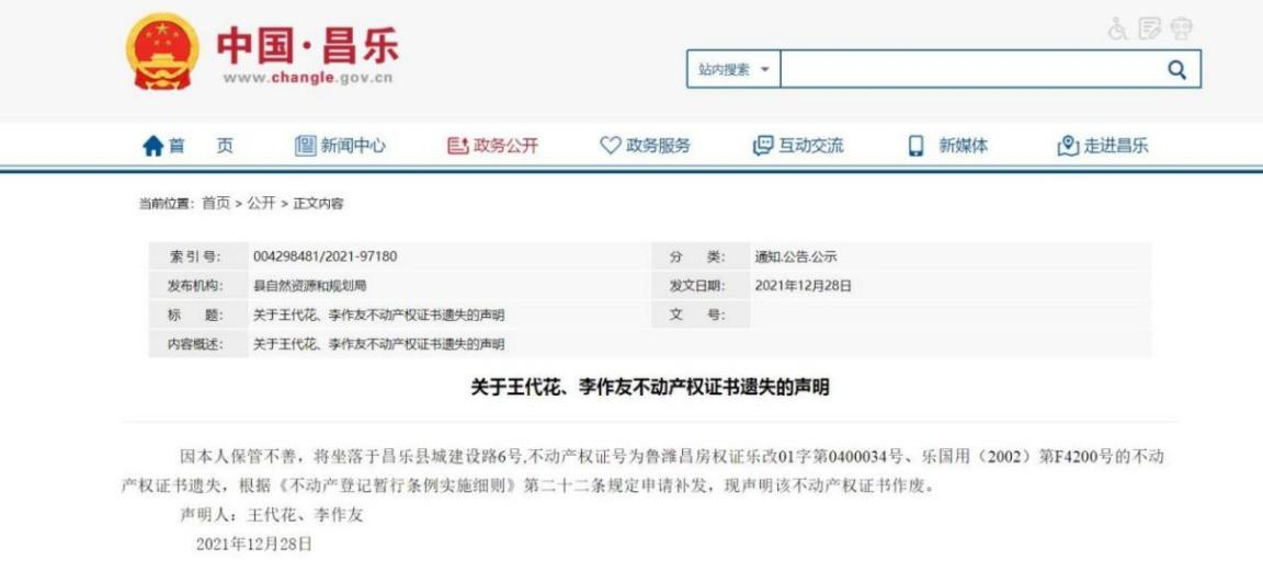 1、重点做好统一确权登记信息公开。按照《不动产登记暂行条例实施细则》的有关规定,不动产权证书或者不动产登记证明遗失、灭失,不动产权利人申请补发的,经县自然资源和规划局不动产登记中心审核后在局门户网站公告,公告期限为15个工作日。