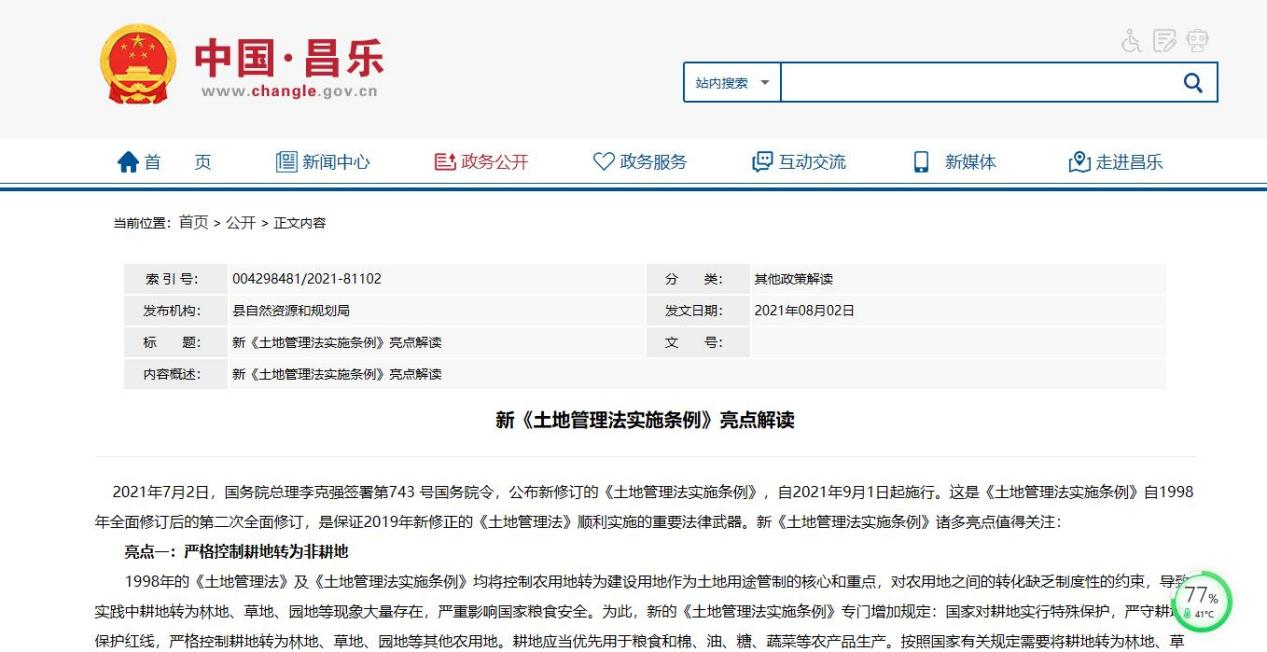3、加强自然资源政策解读。扩大政策解读传播面,2021年度转载发布政策解读文件14件。包括新《土地管理法实施条例》亮点解读、《占用基本农田的6大问题》、《以最严格耕地保护制度筑牢粮食安全防线》等,并在局公众号转载发布,提高政策的到达率和知晓率。
