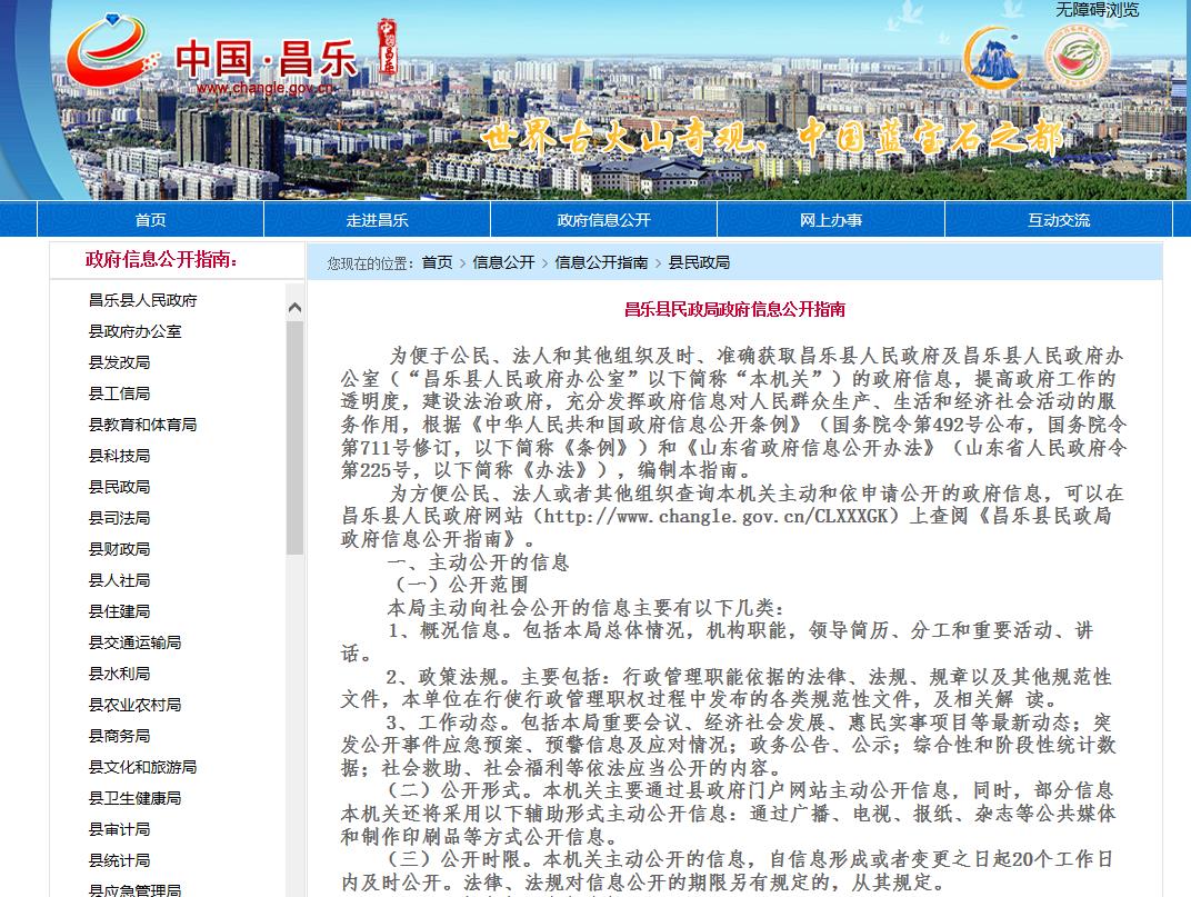 (一)主动公开情况。在昌乐政务网县民政局专栏公布了局机构职能、政策解读、日常工作动态、随机抽查事项、城乡最低生活保障、特困人员救助、临时救助、老年人福利、儿童福利、残疾人两项补贴等情况,全年共公开信息158条。