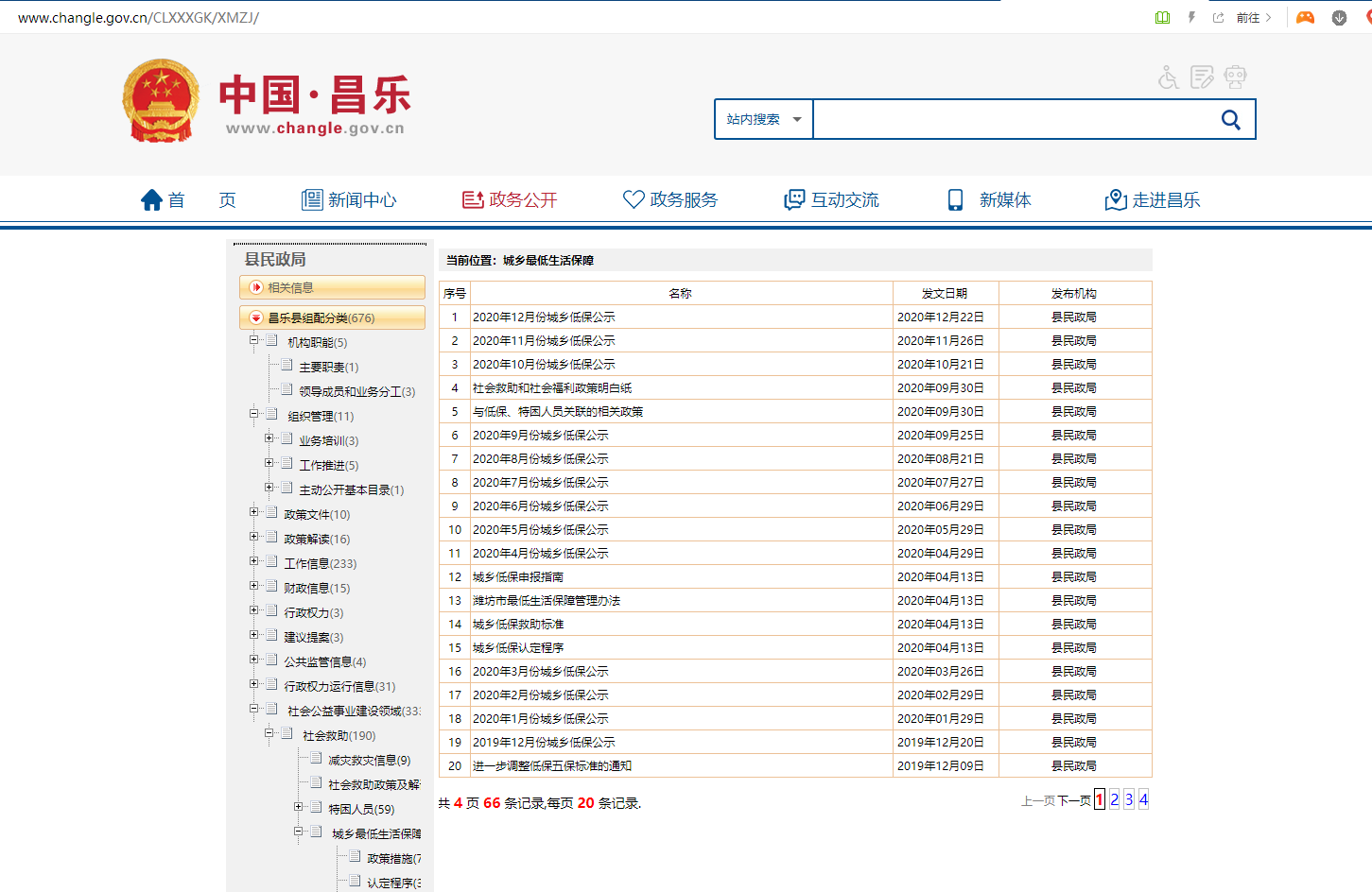 (一)主动公开情况。在昌乐政务网县民政局专栏公布了局机构职能、政策解读、日常工作动态、随机抽查事项、城乡最低生活保障、特困人员救助、临时救助、老年人福利、儿童福利、残疾人两项补贴等情况,全年共公开信息165条。
