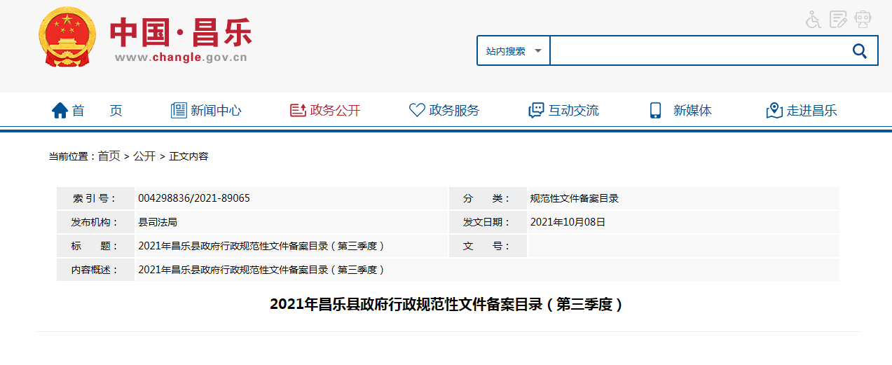 2.及时公开行政法规、规章和规范性文件。根据《政府信息公开条例》第二十条第(一)款要求,及时更新行政法规、规章和规范性信息。每季度公开一次昌乐县政府行政规范性文件备案目录,确保昌乐县政府行政规范性文件备案信息公开工作及时性、准确性。