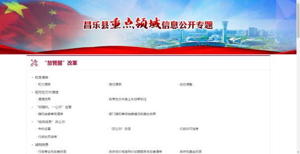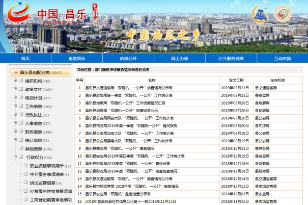 1.“放管服”改革信息公开。结合政府机构改革和职能优化,做好政府部门权责清单调整工作调整情况及时通过昌乐机构编制网、山东政务服务网昌乐县分厅等载体予以公开,有力推动政府部门依法全面规范履职。依据昌乐县“双随机、一公开”监管随机抽查事项清单,多渠道全方位及时公开综合监管和检查执法信息,提高监管效能和公正性依托“信用昌乐”网站和中国昌乐门户网站信用信息“双公示”专栏,持续深化行政许可和行政处罚等信用信息公示工作全年共公开相关信息170余条