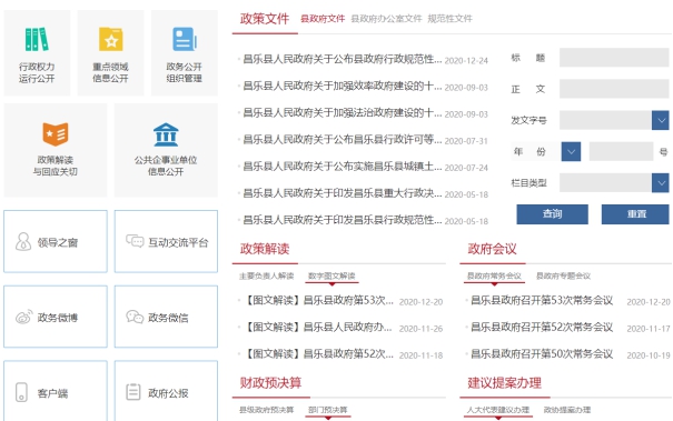 一是扎实做好政府文件和会议公开。在中国昌乐政府门户网站政府信息公开专栏建立“县政府文件集中发布平台”,分类发布县政府文件、县政府办公室文件、规范性文件,每个文件都标明文件名称、成文日期、发布日期、文号和效力状态,全年累计发布以县政府、县政府办公室名义印发的政策性文件、规范性文件38件。设置专题公开县政府全体会议、常务会议、专题会议情况,及时公开相关议定事项并进行解读,全年累计公开县政府常务会议12次,并同步公开了邀请利益相关方、公众代表、媒体等列席会议情况。二是及时更新政府信息主动公开基本目录。根据实际变化情况,更新了主动公开基本目录,进一步明确“五公开”的主体、内容、时限、方式等,对重点领域信息公开内容进行了进一步丰富。三是政策解读更加及时、方式多样。坚持政策性文件与解读方案、解读材料同步,所有政策性文件全部进行了解读,解读的形式包含主要负责人解读、政策简明问答、图文解读、音频解读等。全年累计公开政策解读信息80余条。