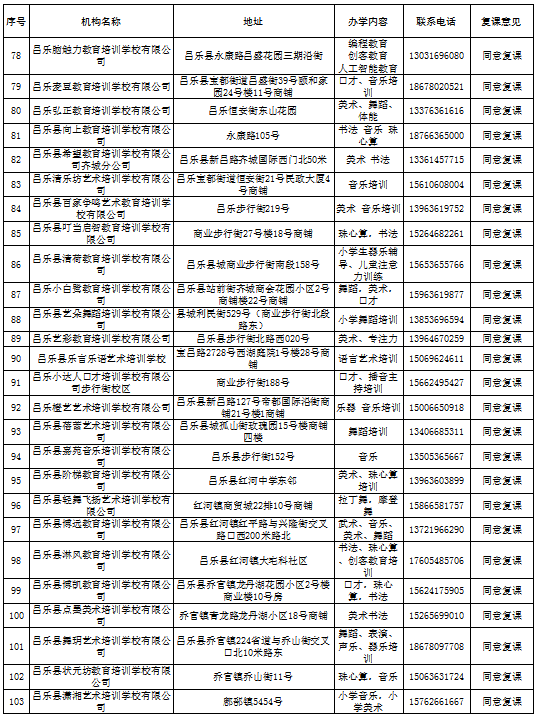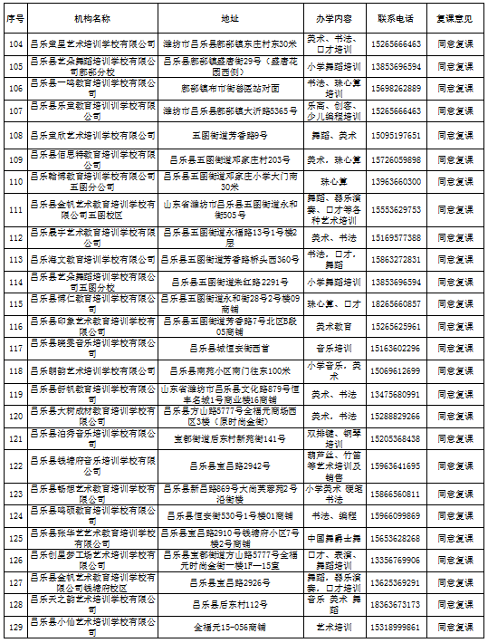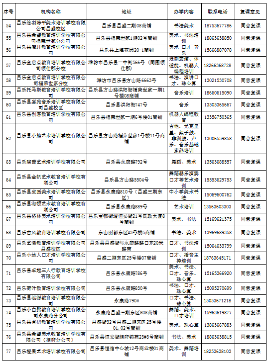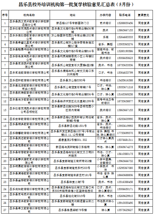 昌乐县校外培训机构第一批复学核验意见汇总表(5月份)