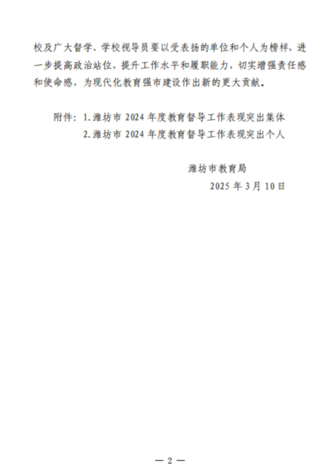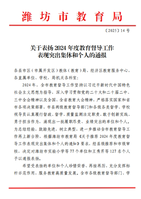近日,潍坊市教育局下发了《关于表扬2024年度教育督导工作表现突出集体和个人的通报》,昌乐县人民政府教育督导室、昌乐县首阳山小学、昌乐北大公学学校、昌乐一中英才实验学校等单位被评为市级教育督导工作表现突出集体,8人被评为市级教育督导工作表现突出个人。