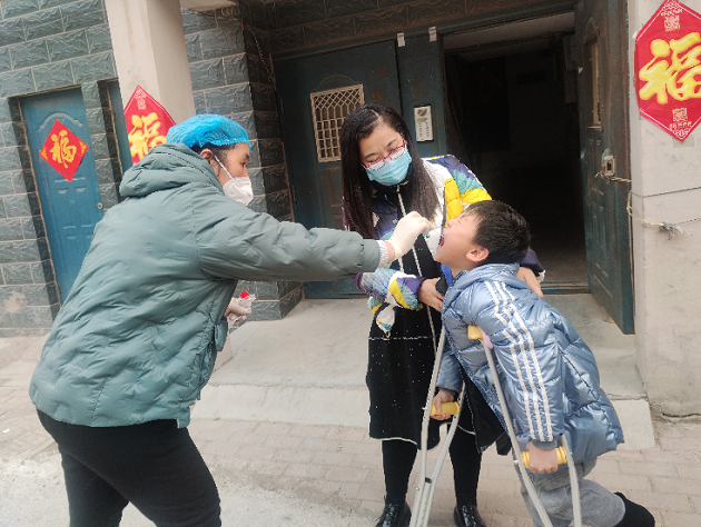 学校三年级三班一名学生居家线上学习期间不慎磕伤脚部,因为上下楼不方便,无法进行核酸检测,学校要求每天对学生进行课后追踪服务,了解他们一天的学习和生活情况,学校得知此事后第一时间由级部主任和教师联系家长,与此同时学校联系好核酸检测人员到楼下等候,赵敏主任和家长一起把学生从楼上背下来,顺利的完成了第三轮核酸检测。
