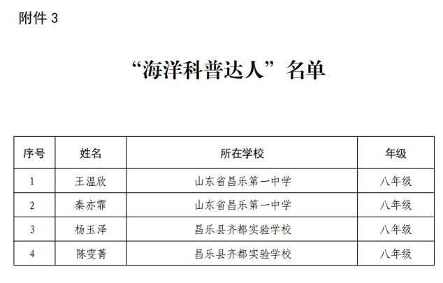 在潍坊市中小学生海洋意识和素养展示活动中,我县4支队伍全部获得优秀团队,4名学生被评为“海洋之星”,4名学生被评为“海洋科普达人”,4名学生被评为“海洋少年”,3名教师被评为“优秀指导老师”,昌乐县教育和体育局被评为“优秀组织单位”。