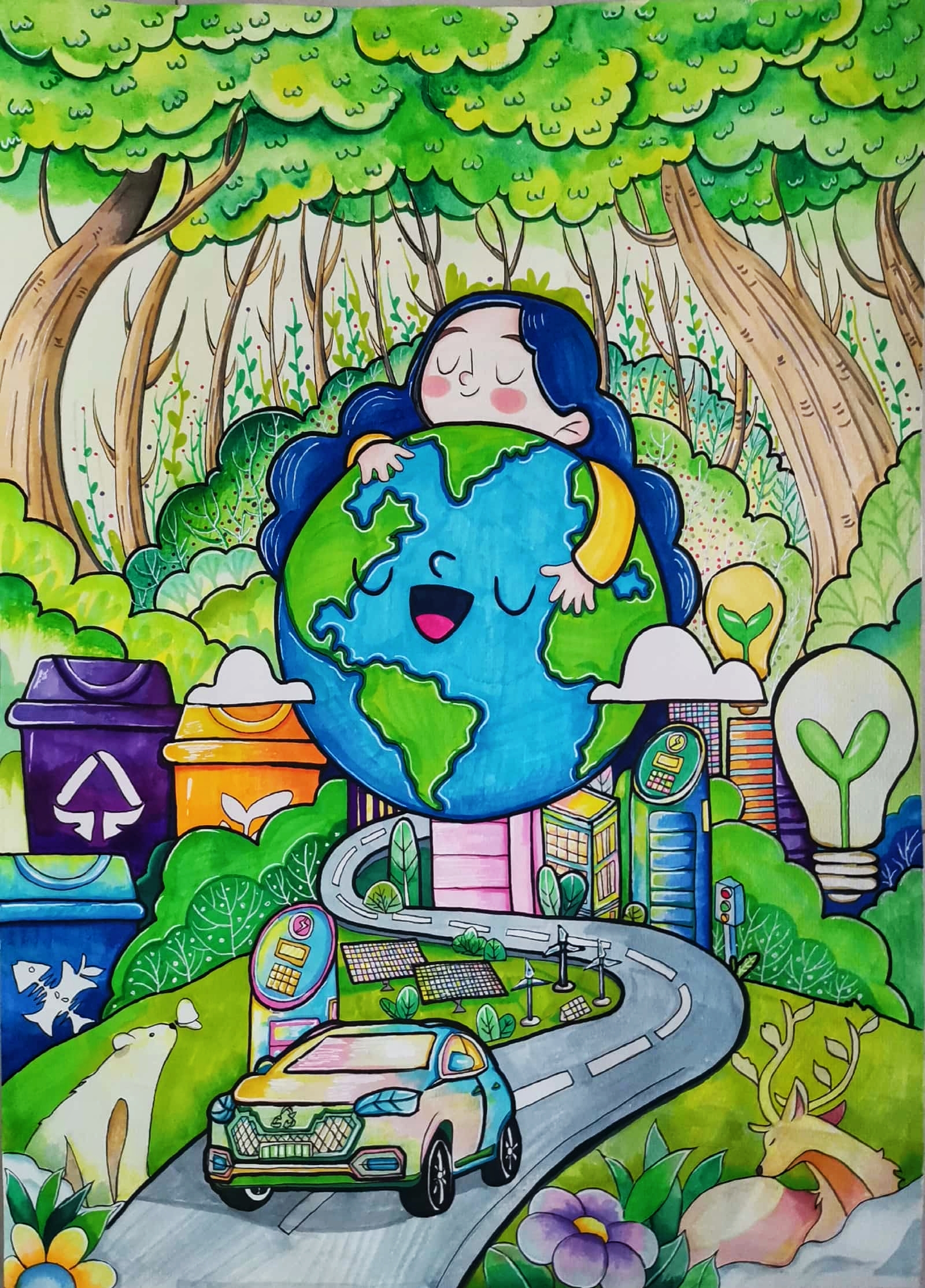 作品主要想体现一个和谐共生的画面,整体为清新的蓝绿色调。画中心是小女孩抱着地球,四周包含低碳出行、能源节约、垃圾分类等细节,向人们传达绿色环保的可持续精神理念。正因为人类与自然息息相关,作品名为尊重自然,拥抱绿色生活意指的是只有遵循大自然法则,爱护自然环境,生态才能良性循环。