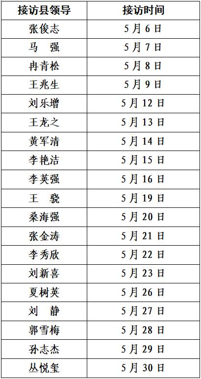 为畅通信访渠道,维护人民群众合法权益,促进社会和谐稳定,现将2025年5月份县级领导公开接待群众来访的有关事宜公告如下: